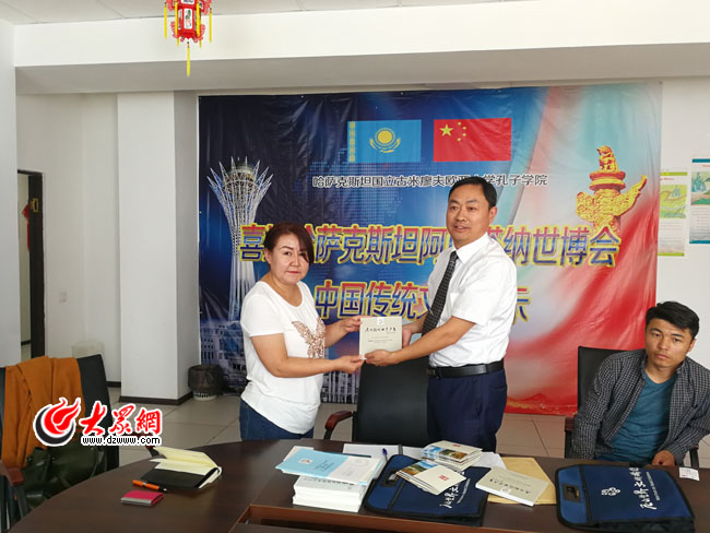 尼山論壇組委會(huì)副秘書長(zhǎng)張景宗(右)向哈薩克斯坦歐亞大學(xué)孔子學(xué)院贈(zèng)送經(jīng)典儒學(xué)書籍。