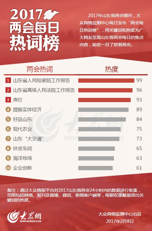大眾網(wǎng)濟南2月8日訊 今天,大眾輿情監(jiān)測中心發(fā)布第四期“兩會每日熱詞榜”!吧綎|省人民檢察院工作報告”“山東省高級人民法院工作報告”和“房價”分別以99、96、93的熱度位居前三。