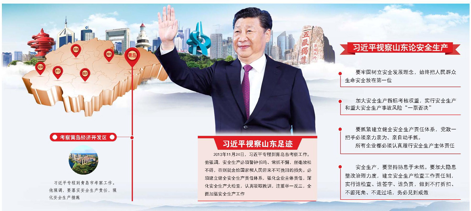◆2013年11月24日,習(xí)近平總書記專程到青島市考察工作。習(xí)近平強(qiáng)調(diào),要牢固樹立安全發(fā)展理念,始終把人民群眾生命安全放在第一位