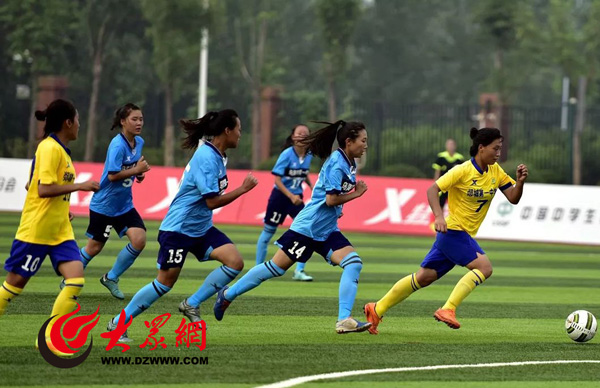郯城一中女足隊員(身著黃色隊服)在比賽中。