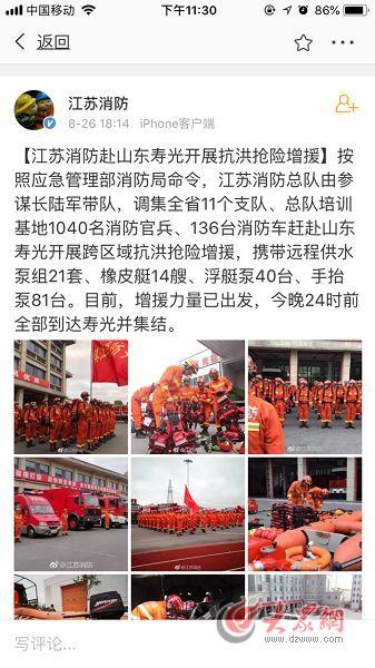 大眾網(wǎng)濰坊8月26日訊(特派記者 王磊 趙洪棟 孫杰 于明效)8月26日下午,鹽城消防支隊(duì)根據(jù)江蘇消防總隊(duì)命令,共調(diào)集人員100人、13車星夜奔赴壽光災(zāi)區(qū)增援,今晚他們冒雨已趕到山東日照附近,預(yù)計(jì)27日凌晨前后到達(dá)壽光。