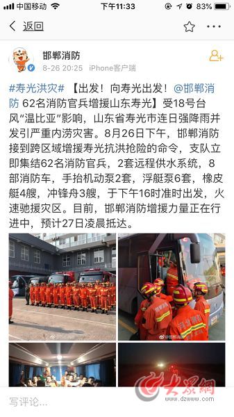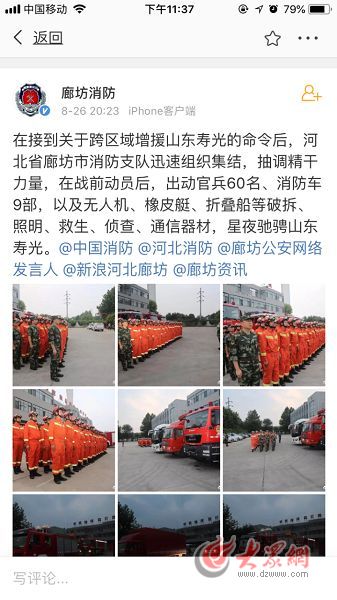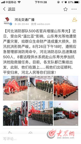 另外,大眾網(wǎng)記者從“南京消防”“揚(yáng)州發(fā)布”“河北交通廣播”“邯鄲消防”等多個(gè)官方微博帳號(hào)搜索發(fā)現(xiàn),目前江蘇和河北等臨近省份的大批消防官兵正向壽光集結(jié),預(yù)計(jì)27日凌晨陸續(xù)到達(dá)。目前,截至8月26日晚22時(shí)許,來(lái)自濟(jì)南消防、聊城消防、青島消防、德州消防、濰坊消防、棗莊消防等的增援官兵陸續(xù)抵達(dá)壽光,在壽光市蔬菜科技博覽園集結(jié),部分消防車輛完成集結(jié)后直奔前線,連夜展開救援。