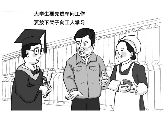 他跟這些大學生說的最多的是:你們書本知識不少,但與企業(yè)要求還隔著一層;別看工人們沒有那么多理論,但幾十年的經驗下來,早已成了專家——你知道毛紡原理,而他懂得怎么紡紗;你們要放下架子向他們學習,否則書本知識就等于零。