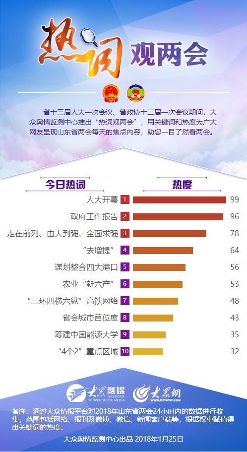 省十三屆人大一次會議、省政協(xié)十二屆一次會議期間,大眾輿情監(jiān)測中心推出“熱詞觀兩會”,用關鍵詞和熱度為廣大網(wǎng)友呈現(xiàn)山東省兩會每天的焦點內(nèi)容,助您一目了然看兩會。
