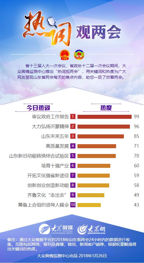 省十三屆人大一次會(huì)議、省政協(xié)十二屆一次會(huì)議期間,大眾輿情監(jiān)測(cè)中心推出“熱詞觀兩會(huì)”,用關(guān)鍵詞和熱度為廣大網(wǎng)友呈現(xiàn)山東省兩會(huì)每天的焦點(diǎn)內(nèi)容,助您一目了然看兩會(huì)。