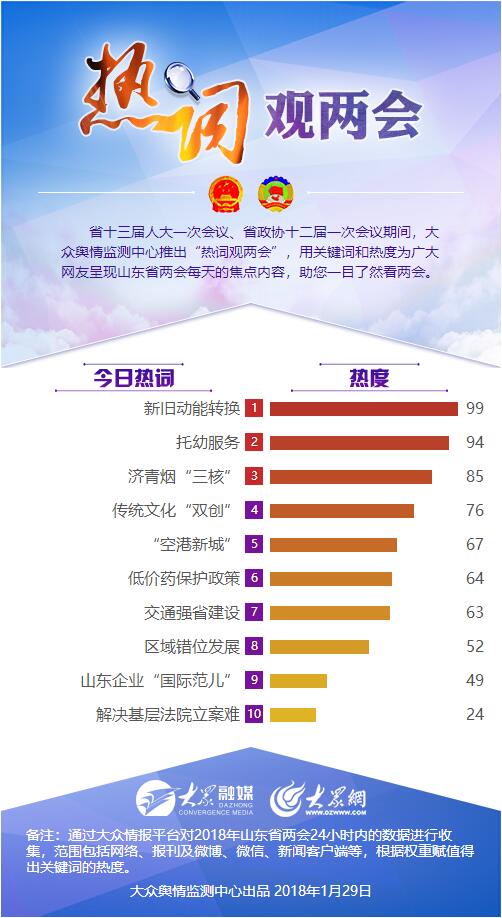 大眾網(wǎng)1月29日訊 29日,大眾輿情監(jiān)測(cè)中心發(fā)布第六期“熱詞觀兩會(huì)”。新舊動(dòng)能轉(zhuǎn)換再次成為熱詞,代表和委員們從多個(gè)方面為我省的新舊動(dòng)能轉(zhuǎn)換工程獻(xiàn)計(jì)獻(xiàn)策。