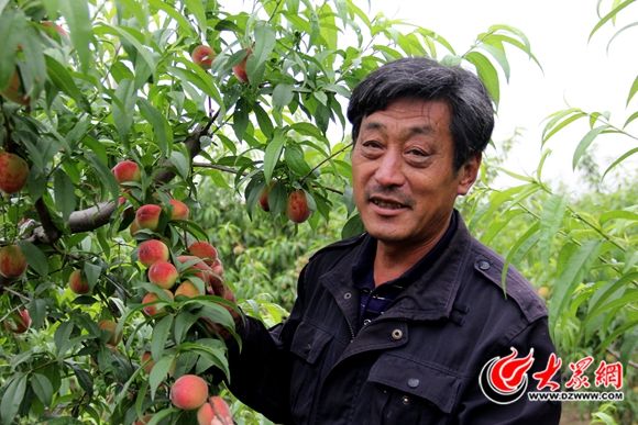 穆李村老果農(nóng)李傳進(jìn)在他種的果園里向記者展示即將成熟的桃子