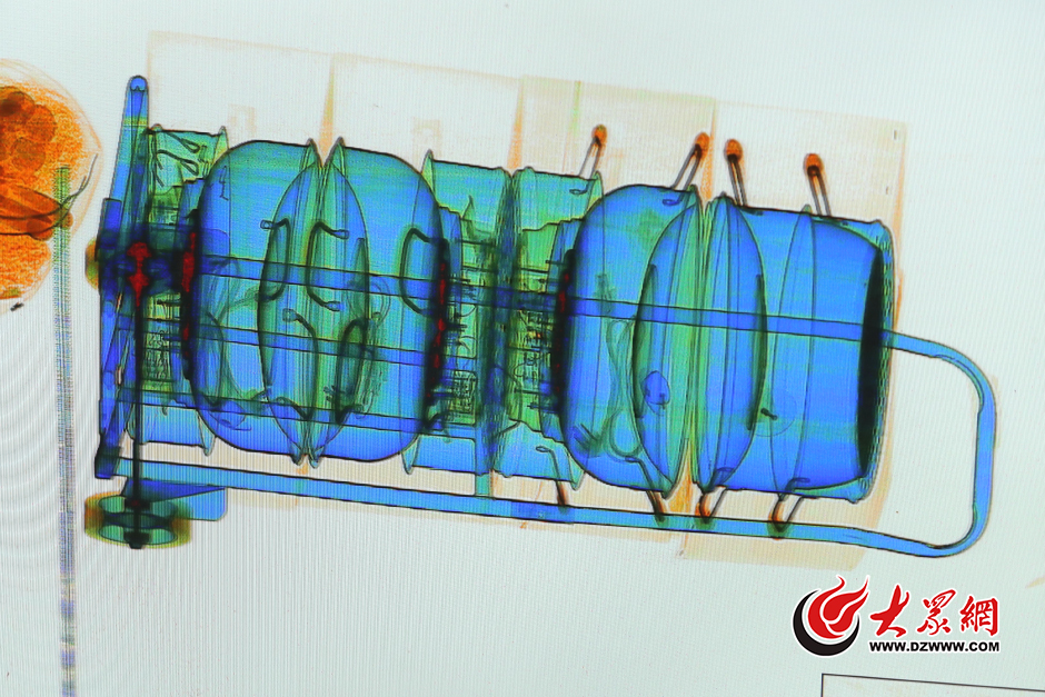 1月19日,2017年春節(jié)越來越近,春運客流逼近高峰,旅客們帶著大包小包的行李踏上回家的旅程。他們的行囊中都裝的啥?1月19日,大眾網(wǎng)記者在濟南火車站,透過車站安檢儀拍攝下了“春運中的行囊”,在安檢儀X光的掃描下,里面物品的輪廓一清二楚。各式的行囊在屏幕上形成了一幅幅濃縮著期盼和向往的歸家圖。圖為安檢儀中的高壓鍋。大眾網(wǎng)記者 王長坤 攝