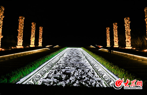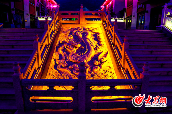 圖為泰山東街一角,雕刻的巨龍?jiān)跓艄獾恼丈湎妈蜩蛉缟?/p>