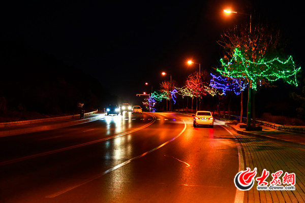 泰山環(huán)山路是連接泰安東西的重要道路,它像一根漂亮的項(xiàng)鏈,將桃花峪、天外村、紅門、天燭峰四大景區(qū)整個(gè)連為一體,是泰山的保護(hù)線、重要的旅游線,也是一條向世界展示泰安形象的名片式景觀大道。現(xiàn)在整個(gè)環(huán)山路兩旁都亮起了五顏六色的燈,絢麗奪目。
