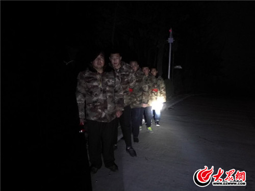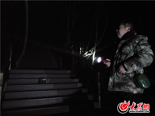 晚7點(diǎn),蒙山防火巡邏隊(duì)準(zhǔn)時(shí)集合,每人領(lǐng)取防火服、對講機(jī)、哨子、手電筒等裝備后分頭行動。大眾網(wǎng)記者跟隨黨員高祥余一組從西側(cè)出發(fā),一行六人步履蹣跚的走在盤山小道上,登高望遠(yuǎn),不放過任何一個(gè)蛛絲馬跡。當(dāng)爬到海拔1000米的山脊線棲鳳山上時(shí),對講機(jī)里不時(shí)傳來“一切正!钡穆曇,林海里也不時(shí)傳來高科技設(shè)備嚴(yán)禁帶火上山的聲音,這恰恰是云蒙景區(qū)寂靜冬夜里最美妙的聲音。正是這一句句的平安預(yù)防提示和守夜人一步步的丈量,共同為這片青山綠水、金山銀山豎起了“防火墻”、“隔離帶”。