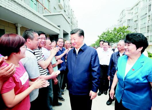 2018年6月12日至14日,中共中央總書記、國家主席、中央軍委主席習(xí)近平在山東視察。這是14日上午,習(xí)近平在濟南市章丘區(qū)雙山街道三澗溪村,同村民們親切交談。□新華社發(fā)