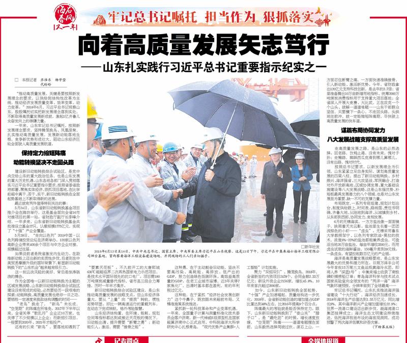 6月10日,大眾日報頭版刊發(fā)重要文章《向著高質(zhì)量發(fā)展矢志篤行》,報道了山東堅持騰籠換鳥、鳳凰涅槃,扎實推動高質(zhì)量發(fā)展,發(fā)展新動能落地生根,競爭新優(yōu)勢形成壯大,驅(qū)動山東經(jīng)濟巨輪全面駛?cè)敫哔|(zhì)量發(fā)展航道。報道指出,動能轉(zhuǎn)換、高質(zhì)量發(fā)展也絕非一日之功,舊動能出清、提升,需要“斷臂之勇”;新動能引入、激活,需要“接骨之能”。