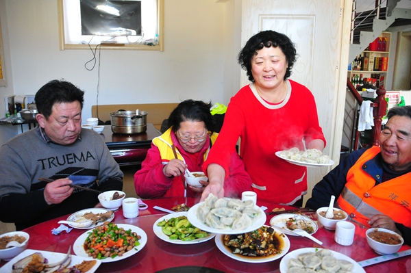 邢威敏(右二)為環(huán)衛(wèi)工人送上可口飯菜