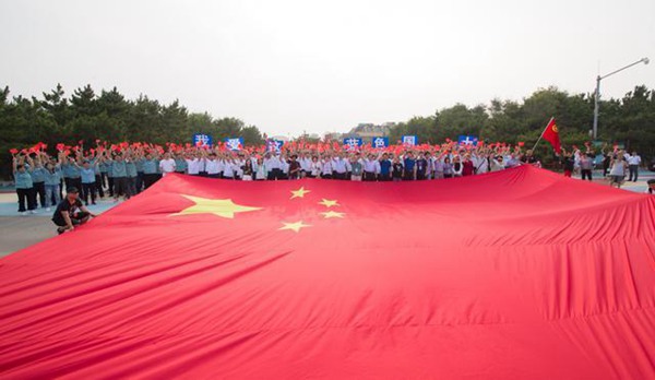 7月15日,日照海濱舉行預熱快閃活動,千人同唱《我愛這藍色國土》。
