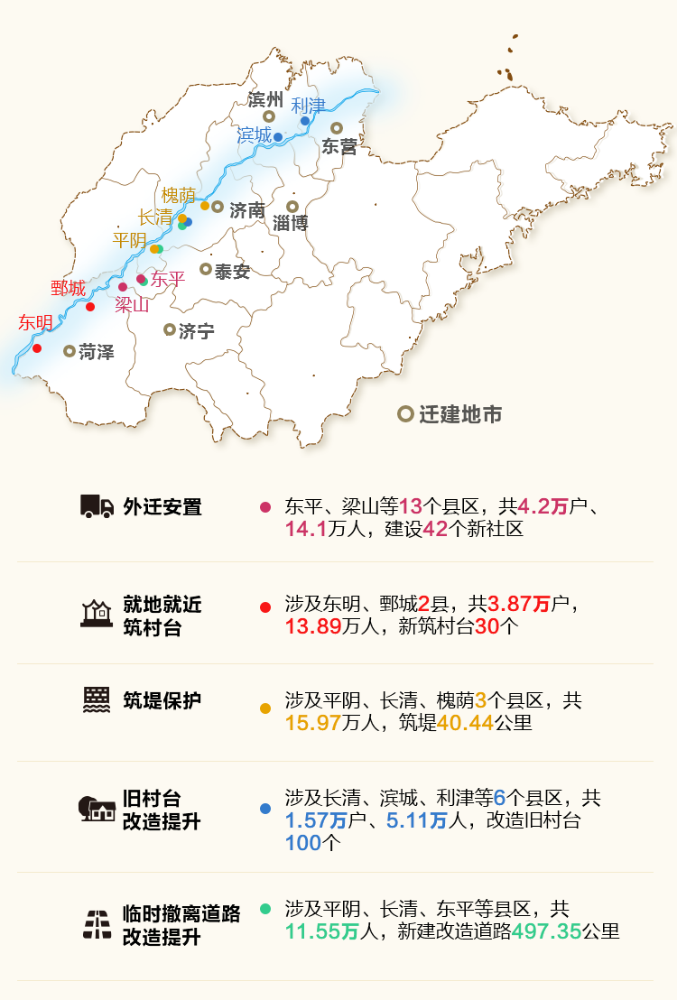 遠(yuǎn)離洪災(zāi)、擺脫貧困、實(shí)現(xiàn)富裕是灘區(qū)人民的希望;搬離房屋簡(jiǎn)陋、交通不便的舊村居,住進(jìn)生態(tài)宜居、功能完備的新社區(qū)是灘區(qū)人民的夢(mèng)想。山東因地制宜,分類施策,計(jì)劃總投資260.06億元,通過外遷安置、就地就近筑村臺(tái)、筑堤保護(hù)、舊村臺(tái)改造提升、臨時(shí)撤離道路改造提升等5種方式,實(shí)施黃河灘區(qū)居民遷建工程。其中,外遷安置人口14.10萬人,就地就近筑村臺(tái)安置13.89萬人,筑堤安置15.97萬人,舊村臺(tái)改造提升安置5.11萬人,采用臨時(shí)撤離措施安置人口11.55萬人。