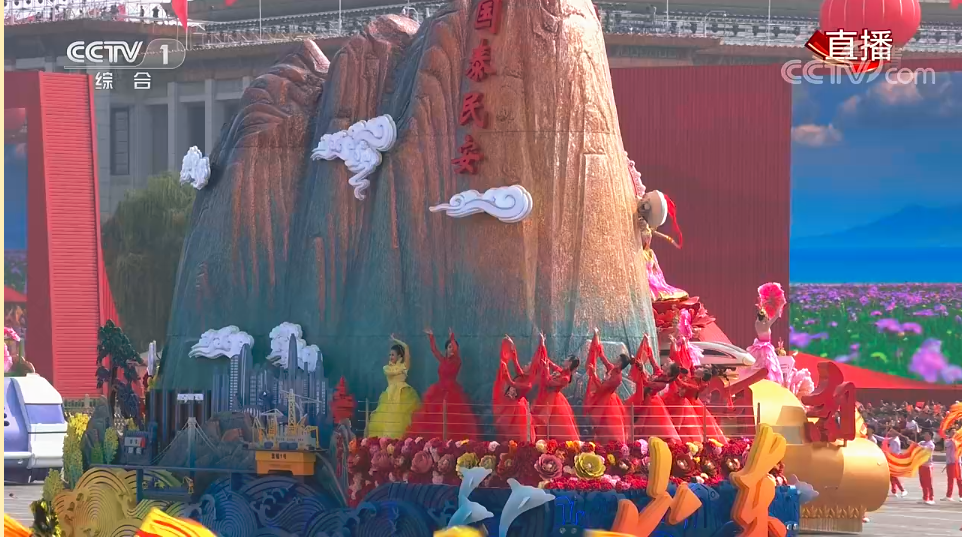 在彩車四周、泰山腳下,舞動著一朵朵艷麗的牡丹花,寓意花開盛世。彩車底部是碧波蕩漾的海浪寓意海洋強(qiáng)省快步向前。同時(shí),車身上還展示了代表山東經(jīng)濟(jì)社會發(fā)展成就的“大國重器”和品牌企業(yè)。比如“藍(lán)鯨1號”、膠州灣跨海大橋、濰柴、浪潮等。