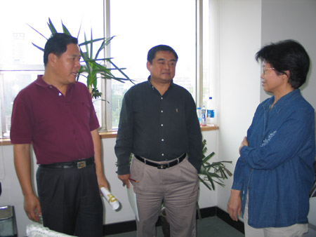 大眾網(wǎng)總編王涪京與海南日報報業(yè)集團副總編輯廉振孝交流工作。