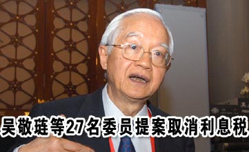 本報(bào)訊 北京消息:昨天下午,包括著名經(jīng)濟(jì)學(xué)家吳敬璉在內(nèi)的27名全國(guó)政協(xié)委員,聯(lián)名向大會(huì)提交了關(guān)于取消利息稅的提案。提案發(fā)起人、政協(xié)委員、河南省工商聯(lián)副會(huì)長(zhǎng)王超斌在下午小組會(huì)上,不到一個(gè)小時(shí)的時(shí)間里就得到了其他26位委員的聯(lián)名支持。