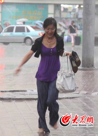 一位女士干脆提著鞋在雨中奔跑。