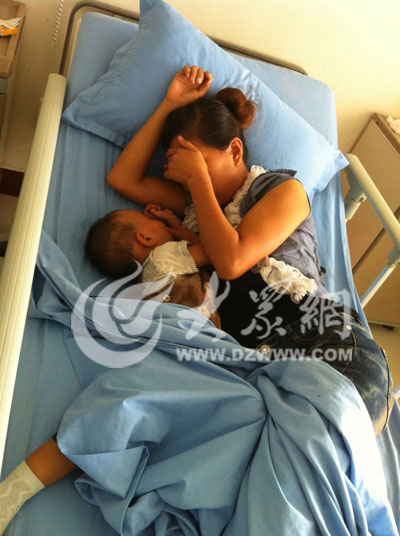被打婦女張某和孩子躺在醫(yī)院的病床上。