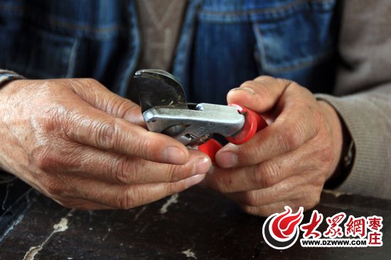于庭柏桌上有一把被布套包裹著的剪刀,那是諾博送給他的一把價值400元的德國產(chǎn)果木修剪剪刀,于庭柏非常珍惜,而在剪刀刀片上有一個小豁口,說起來著實讓于庭柏心疼不已!爱敃r諾博將這把剪刀剛送給我時,和他一起修剪枝條,光顧著和他說話,一沒注意剪到了鐵絲,便留下這一豁口!庇谕グ匦⌒牡啬闷鸺舻睹擞置拔乙恢睕]舍得用,直到去年,我自己買的剪刀也壞了,才換成這把,剪的時候可愛惜著哪!庇谕グ匦⌒牡貙⒓舻吨匦卵b進布套里說道。