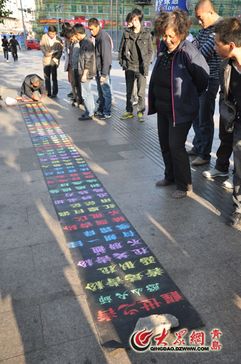 10月8日,崔顯仁從煙臺坐車到了青島,這是他第三次來青島。多年來,在氣候適宜的島城,他走遍了每條商業(yè)街,結(jié)識了不少朋友。除此之外,他對青島還有一份特殊的感情,因?yàn)橐晃缓眯娜说臒?心令他感動萬分、終身難忘。崔顯仁告訴記者,在青島他一般會選擇臺東、科技街和李村公園這樣人多繁華的地方,不少好心人會看到他身材志堅(jiān)、流暢飄逸的粉筆書法便給予一定的幫助,他對每位好 心人都會真誠的說一句“謝謝”。