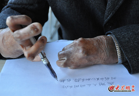 2010年3月,初春的青島依然寒風(fēng)料峭,他只身來到青島海云庵糖球會,靠寫字賣藝。接近傍晚,一位老大爺看到他無助的情況便回家給他端來了一杯熱茶,并拿來了衣 服和一摞書法書籍,老大爺并鼓勵他:“你的字很好,將來肯定會有更好的發(fā)展!”崔顯仁說起這些,對老人充滿了無限感激之情,雖然墨鏡遮擋住燒毀的眼簾,但他那雙眼睛仍泛滿了淚花。他說:“ 這一杯熱茶暖透了我的心!