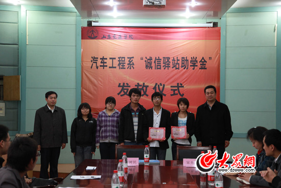 尹玉濤 馬鑫 來源: 大眾網(wǎng)[提要] 10月26日下午3:00,在山東交通學(xué)院汽車博物館內(nèi),該校汽車工程系一場特殊的“誠信驛站助學(xué)金”發(fā)放儀式在這里舉行,提供助學(xué)金的不是大型企業(yè),也不是機(jī)關(guān)單位,而是該系5名普通的大學(xué)生組成的“誠信愛心團(tuán)隊(duì)”,而1000元助學(xué)金來自于他們在校內(nèi)開設(shè)的一個(gè)叫“誠信驛站”的小店。記者了解到,去年4月11日,該系學(xué)生孫鳳慧的“誠信小店”正式開張,這個(gè)小店無人收錢、無人介紹貨品,挑選、付款、找零全由顧客自己辦理,買賣全靠顧客的誠信自覺。至今一年半的時(shí)間過去了,校內(nèi)近8000名大學(xué)生的誠信經(jīng)住了考驗(yàn),在這么長的無人值守時(shí)間里,沒有出現(xiàn)過一次學(xué)生偷盜或者賴賬的事件。