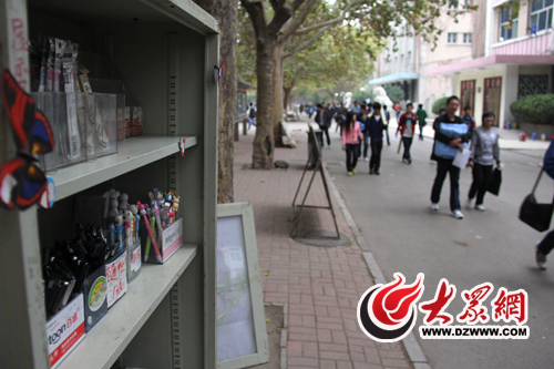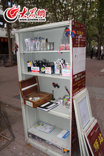 10月26日下午4:30,記者來到山東交通學(xué)院校園內(nèi),“誠信愛心團(tuán)隊(duì)”的5個(gè)人——孫鳳慧、譚成志、趙曼、李書朋、李志欣正在“誠信小店”附近等候。這個(gè)小店位于“交院超市”的對面的一顆大樹下,緊靠著宿舍樓。“小店”并沒有門面,是一個(gè)5層的柜子,整齊碼放著各種學(xué)習(xí)、生活用品,如橡皮、鉛筆、筆筒、筆記本等,學(xué)生們可以根據(jù)所需挑選,然后根據(jù)所標(biāo)價(jià)格把錢放到一個(gè)盒子里,平時(shí)沒有看護(hù)人,桌子上默默無聞的這個(gè)錢箱是唯一在場的“經(jīng)營者”,旁邊有一個(gè)小店的簡介、倡議書、聯(lián)系電話和前一天的“理應(yīng)收入”與“實(shí)際收入”。
