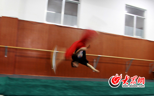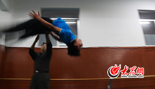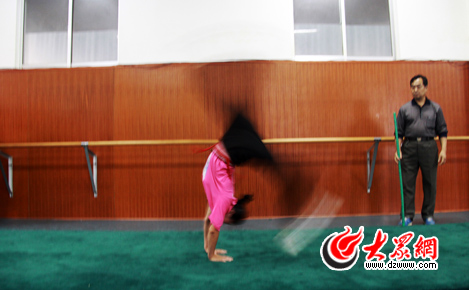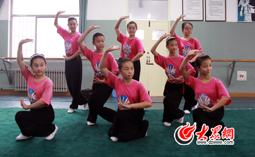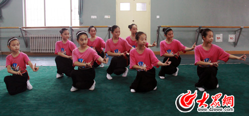 9月21日下午,記者來到山東省電影學校的練功房,該校2011級京劇班的學生正在上基訓課,三個剛剛入學的2011級京劇班女生朱釩萌、仉澤宇、楊雨辰正在壓腿,而這三個女生都是來自濟南的。其中,9歲的朱釩萌是育新小學的,12歲的仉澤宇是千佛山小學的,11歲的楊雨辰是歷下實驗小學的,3個人都考上了山東省電影學校2011年的京劇班,而她們的目標都是——“長大了考中國戲曲學院,成為名角!”