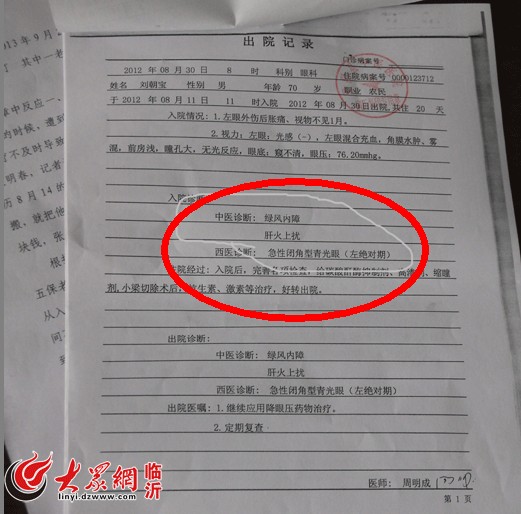 劉朝香隨后向記者出示了醫(yī)院的診斷證明,說“這個能證明他左眼是被打瞎的”。大眾網(wǎng)記者看到,這是蒙陰縣中醫(yī)院在2012年8月30日出具的病例診斷證明,在入院診斷和出院診斷上,都明確寫著“急性閉角型青光眼(左絕對期)”。