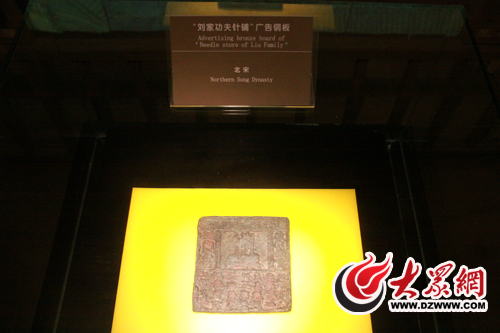 “我們現(xiàn)在展覽的是銅板的復(fù)制品,文物的原件現(xiàn)在藏于北京的中國(guó)歷史博物館!睗(jì)南市博物館李館長(zhǎng)對(duì)記者說(shuō),現(xiàn)在在濟(jì)南市博物館的二樓,的確有一個(gè)北宋“濟(jì)南劉家功夫針?shù)仭钡膹V告銅印版的展位,這個(gè)廣告銅板主要是用作展現(xiàn)濟(jì)南古代商業(yè)文化的一個(gè)歷史物證對(duì)外進(jìn)行展覽。