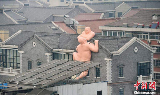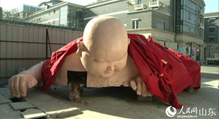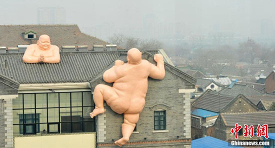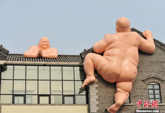 1月19日,中新網(wǎng)發(fā)了一組名為《攀房“裸佛”亮相濟(jì)南 似現(xiàn)實版“佛跳墻”》的圖片,圖片中,有兩個肉色的大型雕塑,一個“坐在”某兩層火鍋店的樓頂,一個攀附在墻上,做用力向上攀爬的姿勢。兩個雕塑造型都為年輕的胖子,其中坐在房頂?shù)呐肿佑薪赘,雙手合十,耳垂飽滿,很像一尊佛;爬墻的“胖子”有近六米高。因為爬墻的“胖子”背面赤裸,所以在網(wǎng)絡(luò)轉(zhuǎn)載和評論中,有網(wǎng)友將這兩尊雕塑稱為“裸佛”。
