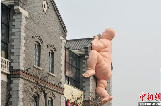 1月19日,中新網(wǎng)發(fā)布了濟(jì)南兩尊雕塑“爬墻”的圖片。(圖片來自中新網(wǎng))