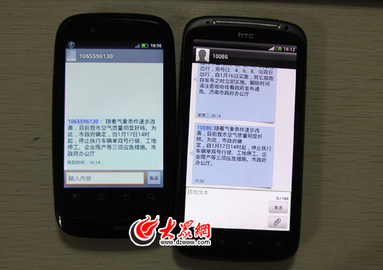 大眾網(wǎng)濟(jì)南1月17日訊(記者 王磊)今天下午16時許,濟(jì)南市民陸續(xù)收到由市政府辦公廳委托移動和聯(lián)通等電信運營商群發(fā)的短信提醒,從今天下午14時起,停止執(zhí)行車輛單雙號行駛、工地停工、企業(yè)限產(chǎn)等三項應(yīng)急措施。