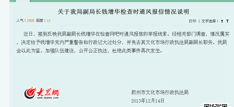 隨后,大眾網(wǎng)記者在12月14日公開發(fā)布的《關(guān)于我局副局長錢增華檢查時通風(fēng)報信情況說明》上看到如下處理結(jié)果:近日,接到反映我局副局長錢增華在檢查網(wǎng)吧時通風(fēng)報信的舉報線索。經(jīng)相關(guān)部門調(diào)查,情況屬實,決定給予錢增華黨內(nèi)嚴(yán)重警告和行政記大過處分,并免去其文化市場行政執(zhí)法局副局長職務(wù)。我局會以此為鑒,加強隊伍建設(shè),公開公正執(zhí)法,杜絕此類事件再次發(fā)生。該說明的落款為:膠州市文化市場行政執(zhí)法局。