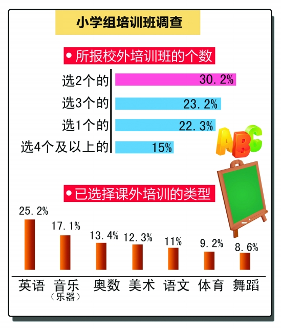 記者對(duì)杭城兩個(gè)班級(jí)做了一個(gè)調(diào)查,一個(gè)班是小學(xué)三年級(jí),一個(gè)班是初二。調(diào)查發(fā)現(xiàn),三年級(jí)這個(gè)班學(xué)生42人,38人在杭州青少年活動(dòng)中心至少有一項(xiàng)培訓(xùn);初二班級(jí)45人,只有4個(gè)學(xué)生參加了青少年活動(dòng)中心的社團(tuán)活動(dòng),有32人參加了校外的輔導(dǎo)班“補(bǔ)習(xí)”。