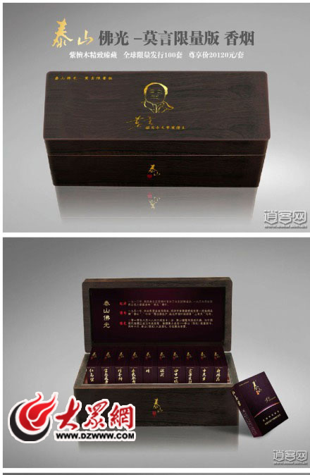 大眾網(wǎng)濟(jì)南12月19日訊(記者 王磊)近日,一則莫言將為山東煙草品牌“泰山佛光”代言的傳言引發(fā)網(wǎng)友熱議。有網(wǎng)友爆料稱(chēng),即將推出“莫言限量版”香煙,每支煙均以《紅高粱》、《檀香刑》、《生死疲勞》等10部莫言小說(shuō)命名,并采用了極為奢華的紫檀木包裝,限量銷(xiāo)售100套,每套售價(jià)20120元。