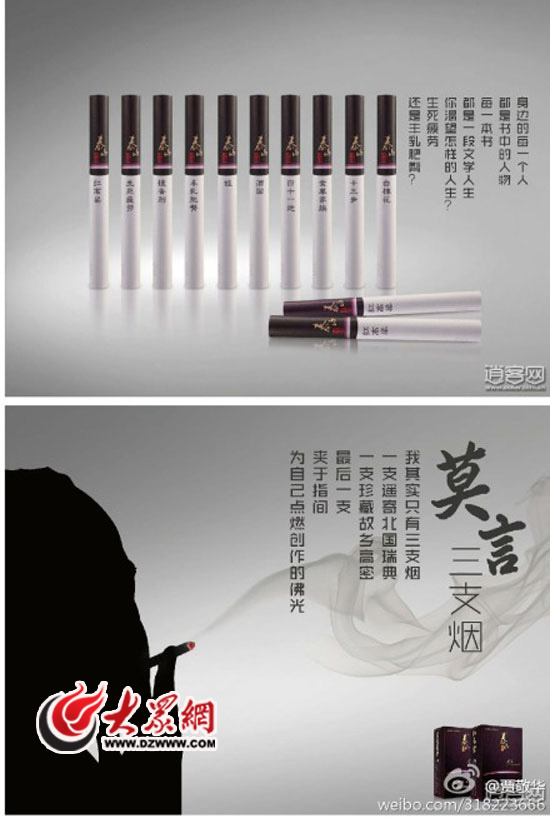 近日,一則莫言將為山東煙草品牌“泰山佛光”代言的傳言引發(fā)網(wǎng)友熱議。有網(wǎng)友爆料稱(chēng),即將推出“莫言限量版”香煙,每支煙均以《紅高粱》、《檀香刑》、《生死疲勞》等10部莫言小說(shuō)命名,并采用了極為奢華的紫檀木包裝,限量銷(xiāo)售100套,每套售價(jià)20120元。