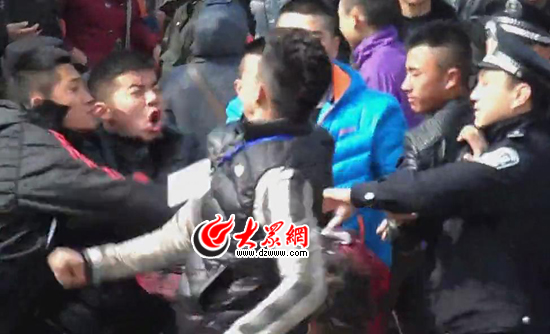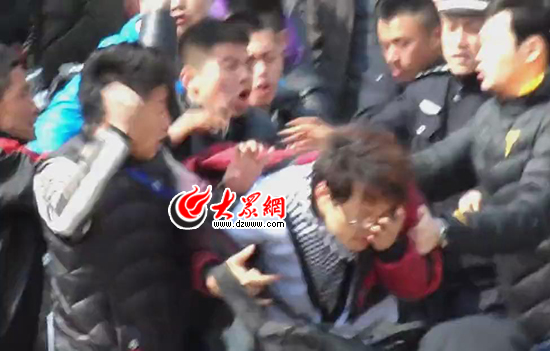 該網(wǎng)友告訴大眾網(wǎng)記者,在得知票已售盡后,數(shù)千名沒買到球票的球迷都仍然圍著售票處不愿離去,集體抗議票務(wù)公司的行為。正在這時(shí),人群中突然傳來一陣罵喊聲,有四五個(gè)胸前掛著“票務(wù)稽查”證件的工作人員突然對一名身穿紅色羽絨服的男子大打出手。在四五個(gè)工作人員圍攻下,該男子擠出人群并跑出了省體育中心北門。