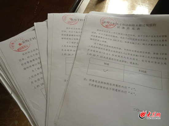 今年1月9日,金溝子村召開村民大會,向占全體村民99%的上樓戶發(fā)放“依法拆除未搬遷房屋的征求意見表”,其中有90%以上的村民在同意欄打了對號。