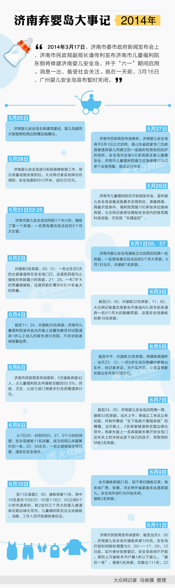 2014年6月11日,濟南市民政局發(fā)布消息稱,截至當天9:00,濟南嬰兒安全島共接收棄嬰106名。安全島開放時間暫時調(diào)整為9:00——17:00。12日起,實行身份信息登記,安全島夜間不開放。原則上只接收本市戶籍1歲以下嬰兒!白詈笠灰埂,接收5名棄嬰,總數(shù)達111名。22:10分,一名10歲的腦癱女孩被遺棄在馬路中間,打破“年齡最大”紀錄。