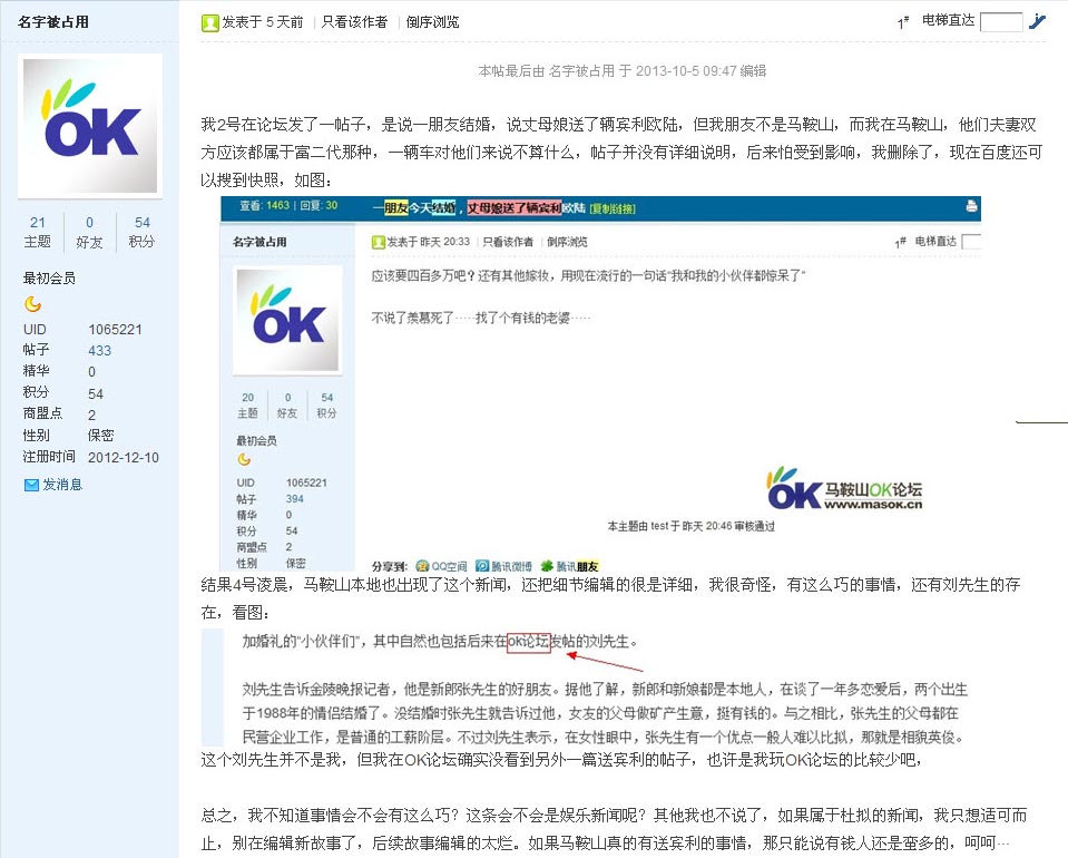 “我2號在論壇發(fā)了一帖子,是說一朋友結婚,說丈母娘送了輛賓利歐陸,但我朋友不是馬鞍山,而我在馬鞍山,他們夫妻雙方應該都屬于富二代那種,一輛車對他們來說不算什么,帖子并沒有詳細說明,后來怕受到影響,我刪除了,現(xiàn)在百度還可以搜到快照,如圖(附圖1),結果4號凌晨,馬鞍山本地也出現(xiàn)了這個新聞,還把細節(jié)編輯得很是詳細(附圖2),我很奇怪,有這么巧的事情,還有劉先生的存在,看圖這個劉先生并不是我,但我在OK論壇確實沒看到另外一篇送賓利的帖子,也許是我玩OK論壇的比較少吧,總之,我不知道事情會不會有這么巧?這條會不會是娛樂新聞呢?其他我也不說了,如果屬于杜擬的新聞,我只想適可而止,別在編輯新故事了,后續(xù)故事編輯得太爛。如果馬鞍山真的有送賓利的事情,那只能說有錢人還是蠻多的,呵呵……”