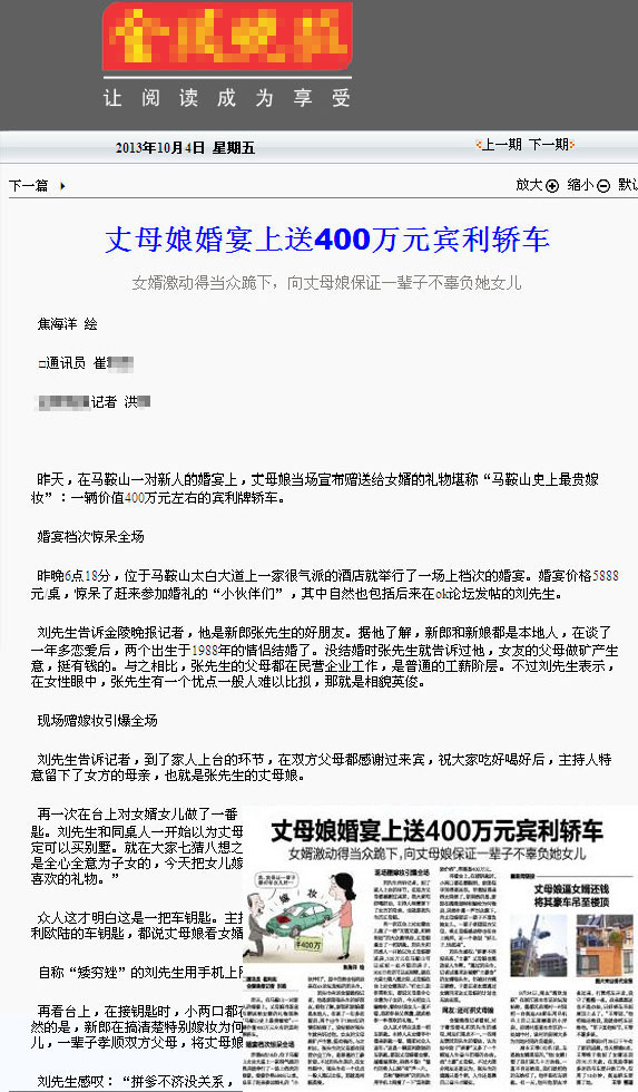 10月4日南京某報的《丈母娘婚宴上送400萬元賓利轎車》報道