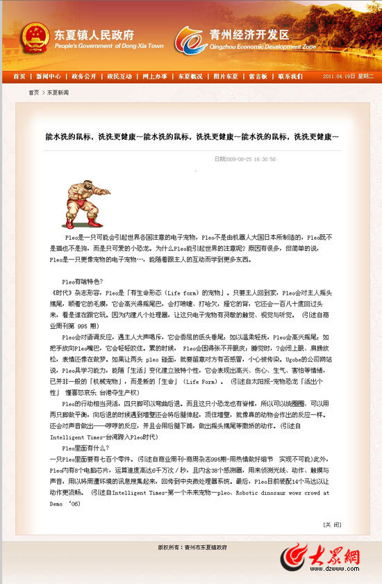 同時(shí),網(wǎng)友“MRWF”還將該政府網(wǎng)站的截圖和地址鏈接(http://qzrsj.gov.cn )發(fā)到了網(wǎng)上。根據(jù)網(wǎng)友提供的鏈接,記者點(diǎn)擊進(jìn)入了東夏鎮(zhèn)人民政府網(wǎng)站,發(fā)現(xiàn)該政府網(wǎng)站首頁(yè)設(shè)置了“東夏動(dòng)態(tài)”、“熱點(diǎn)鎮(zhèn)區(qū)”、“黨務(wù)信息”等欄目,但各個(gè)欄目下多數(shù)文章內(nèi)容的標(biāo)題均為“能水洗的鼠標(biāo),洗洗更健康”,點(diǎn)擊進(jìn)入后文章內(nèi)容是一個(gè)關(guān)于“Pleo”電子寵物產(chǎn)品的介紹,在頁(yè)面的醒目位置還有一個(gè)搞笑的FLASH動(dòng)畫(huà)。