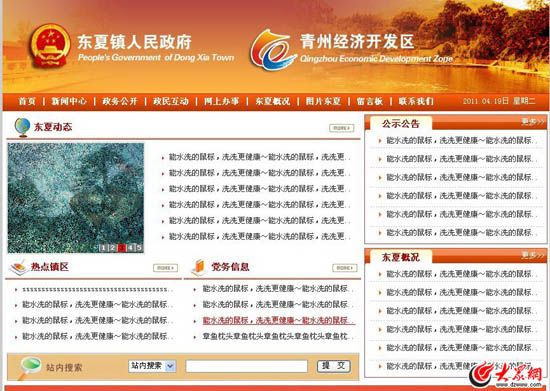大眾網(wǎng)濟(jì)南4月19日訊(記者 王磊)今天上午,大眾網(wǎng)濰坊論壇一則《青州市東夏鎮(zhèn)人民政府網(wǎng)站——洗洗更健康》的帖子(http://club.dzwww.com/viewthread.php?tid=24933939&extra=page%3D1)引發(fā)網(wǎng)友關(guān)注,被跟帖的網(wǎng)友戲稱為“中國(guó)最健康的網(wǎng)站”。網(wǎng)友“MRWF”在發(fā)帖中稱,一位網(wǎng)友在網(wǎng)上查閱青州市東夏鎮(zhèn)資料時(shí),無(wú)意間走進(jìn)了這個(gè)充滿“喜劇”的網(wǎng)站——青州市東夏鎮(zhèn)人民政府網(wǎng),該政府網(wǎng)站首頁(yè)及“黨務(wù)信息”等欄目下文章標(biāo)題幾乎全是“能水洗的鼠標(biāo),洗洗更健康”,而點(diǎn)擊標(biāo)題后,文章內(nèi)容則是一篇關(guān)于某電子寵物產(chǎn)品的介紹。