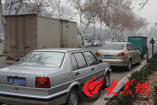 彩色路面被擠占,也大大影響了快車道的正常運(yùn)行。記者發(fā)現(xiàn),由于道路兩側(cè)均停滿了汽車,原本雙向四車道的文化西路在省中醫(yī)至齊魯醫(yī)院路段被“瘦身”成雙向兩車道。從東西方向駛來的機(jī)動(dòng)車每每行至此處,便要由兩列合成一列。尤其是齊魯醫(yī)院門口,拐入醫(yī)院的、等待進(jìn)停車場(chǎng)的、由醫(yī)院內(nèi)駛出的,即使有工作人員不斷疏導(dǎo),仍難以避免“交通死結(jié)”現(xiàn)象的出現(xiàn)。