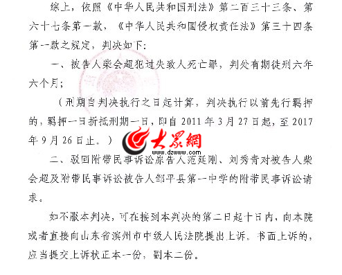 大眾網(wǎng)濟南10月8日訊(記者 王磊)近日,無棣縣人民法院對去年3月發(fā)生的鄒平一中“談話死”案件作出一審判決,被告人柴某因過失致人死亡罪,被判有期徒刑六年六個月。同時,法院駁回了死者范某父母提出的附帶民事訴訟請求。對此,柴某及其家人表示不服,稱將向濱州市中級人民法院提出上訴。