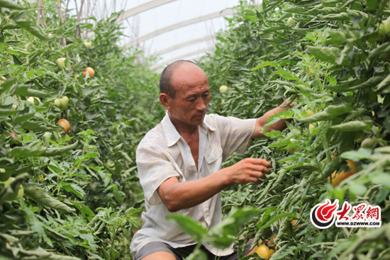 菜農(nóng)趙連先在自家大棚地里查看西紅柿的長(zhǎng)勢(shì)